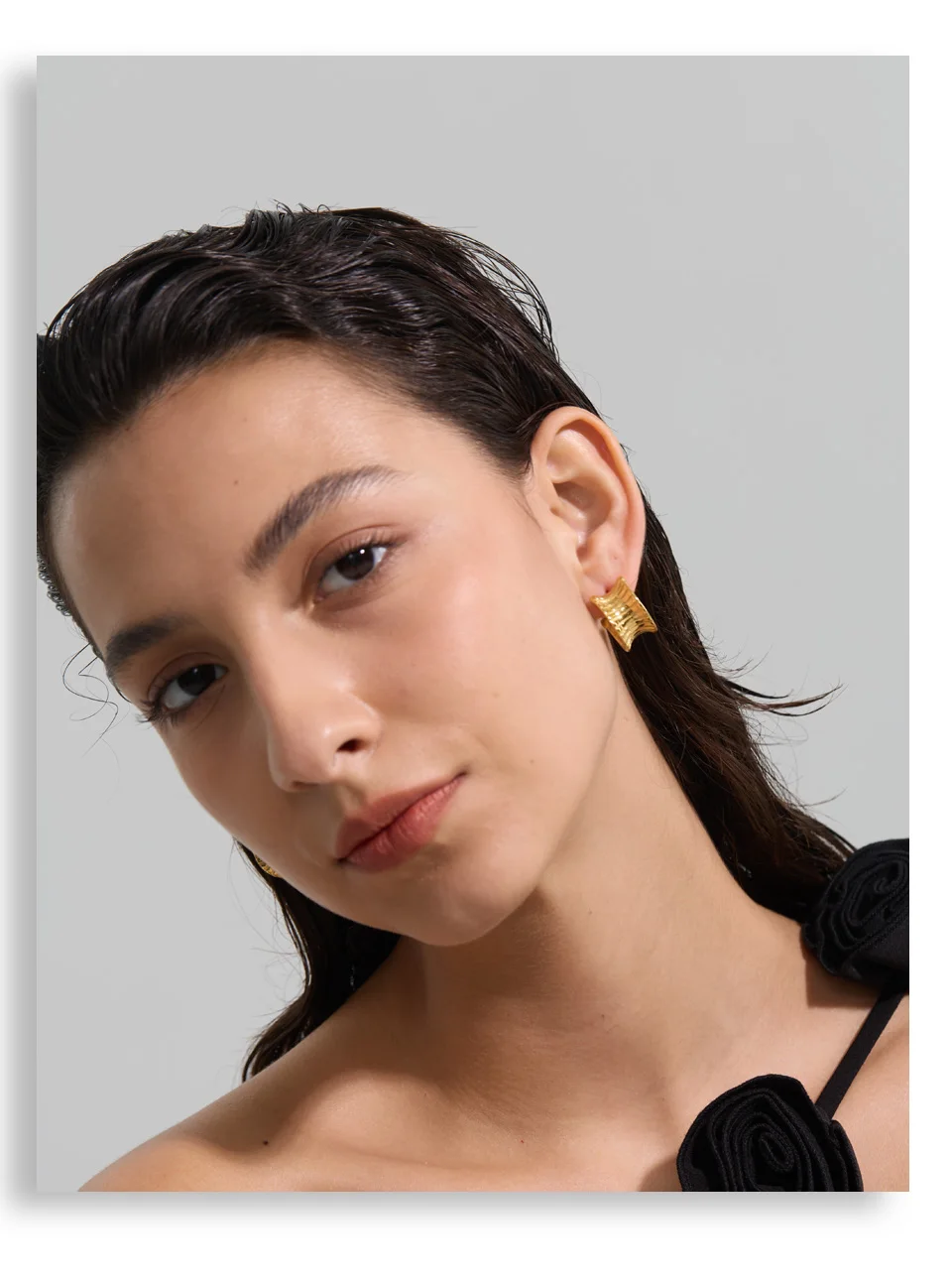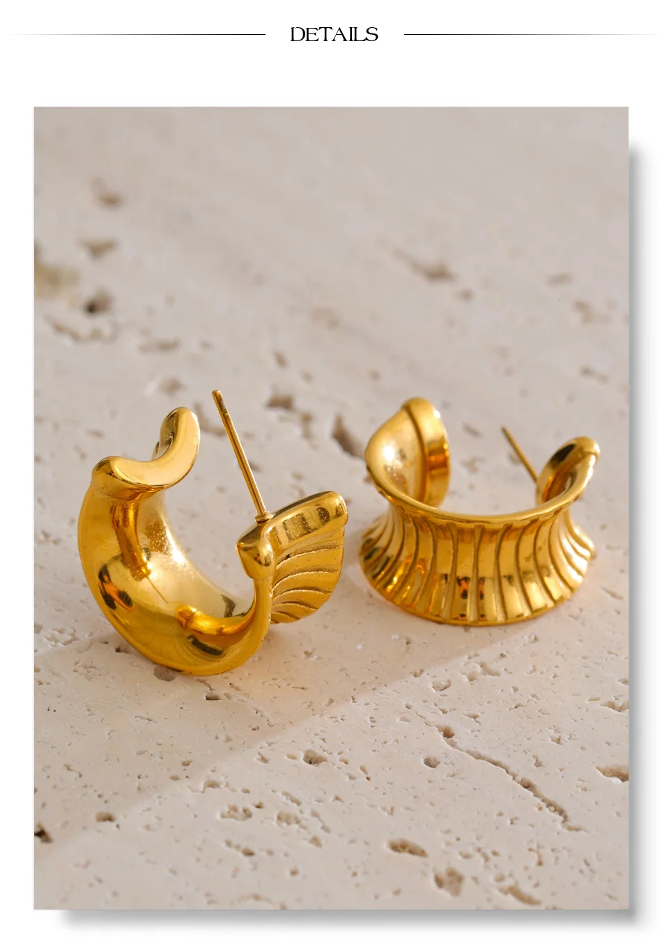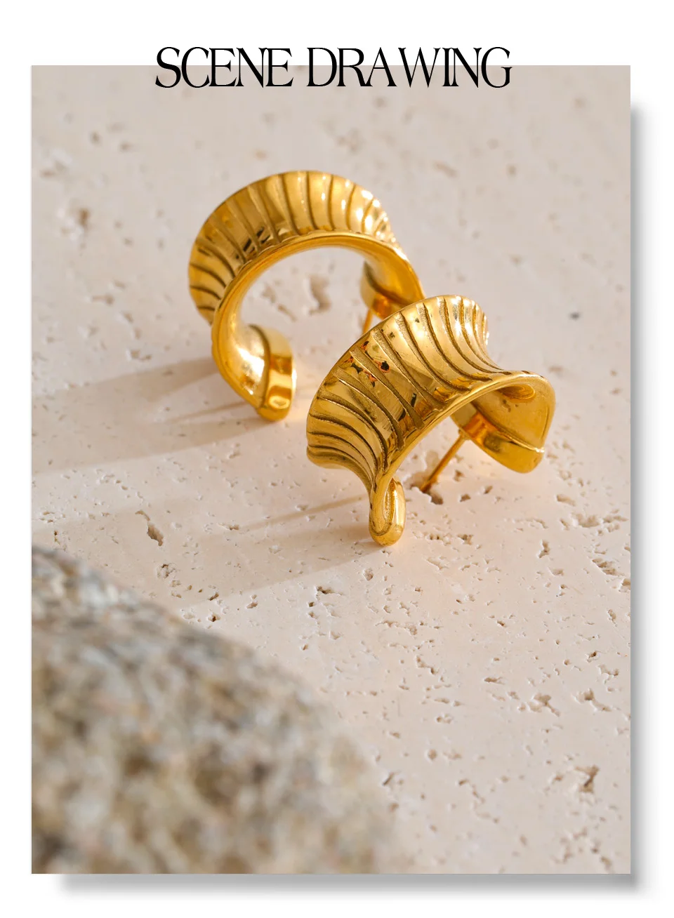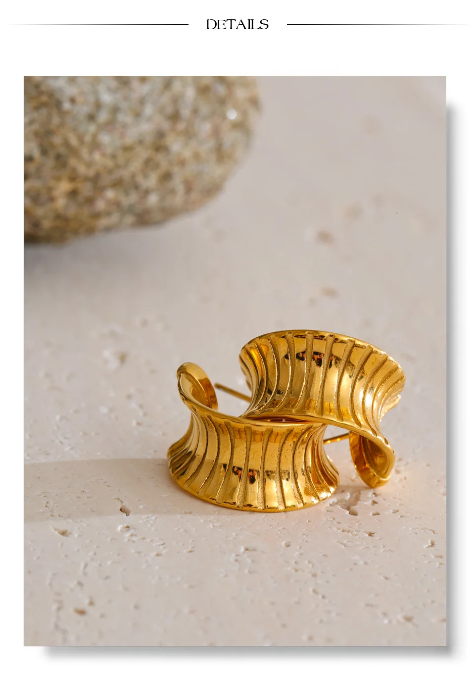 Brincos estilo huggie em formato C, com textura listrada e design moderno que traz elegância imediata ao visual.