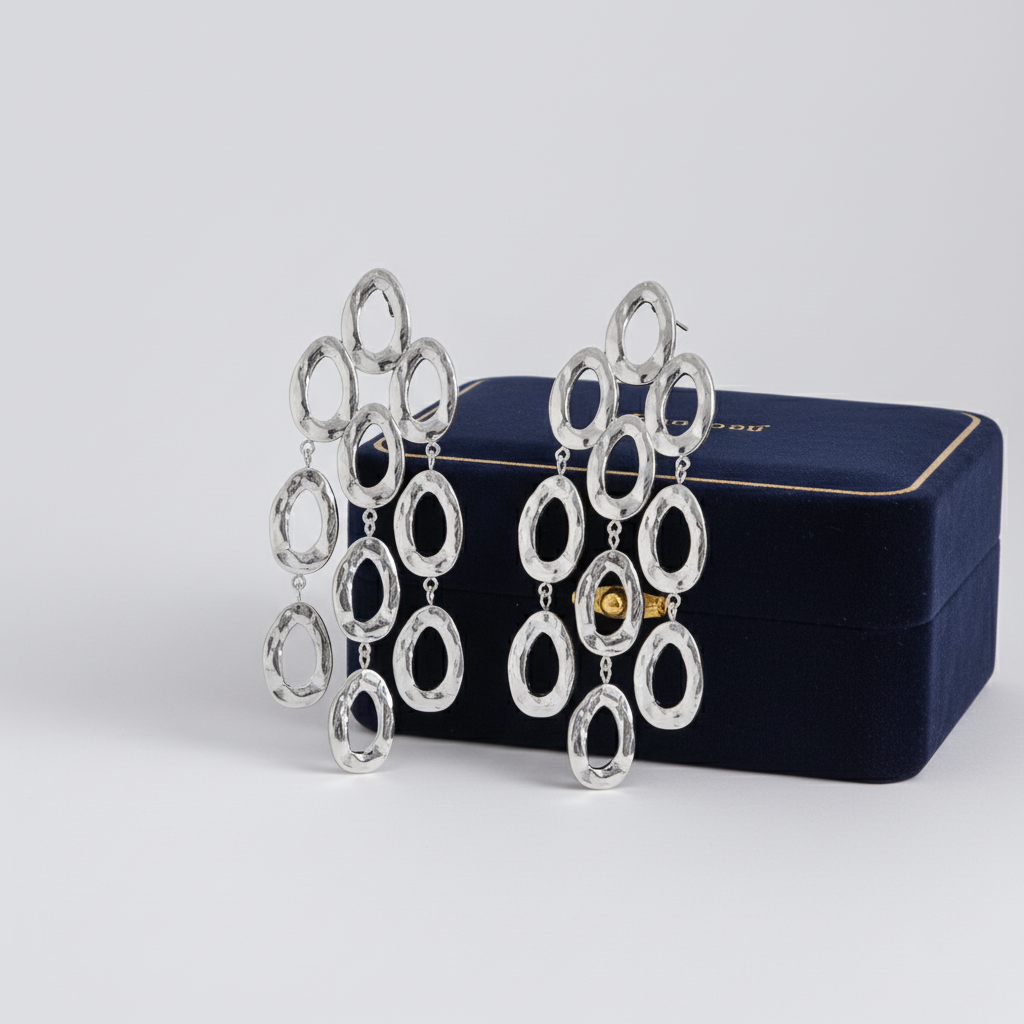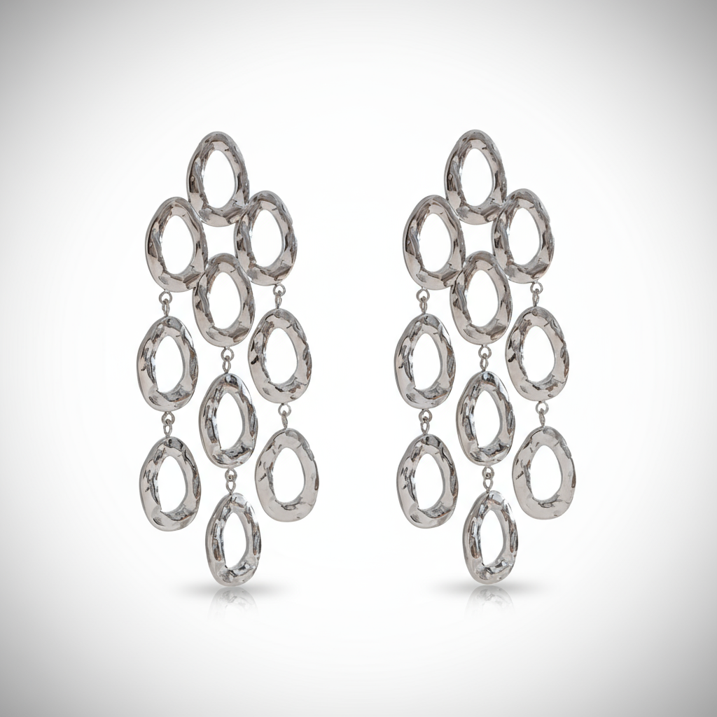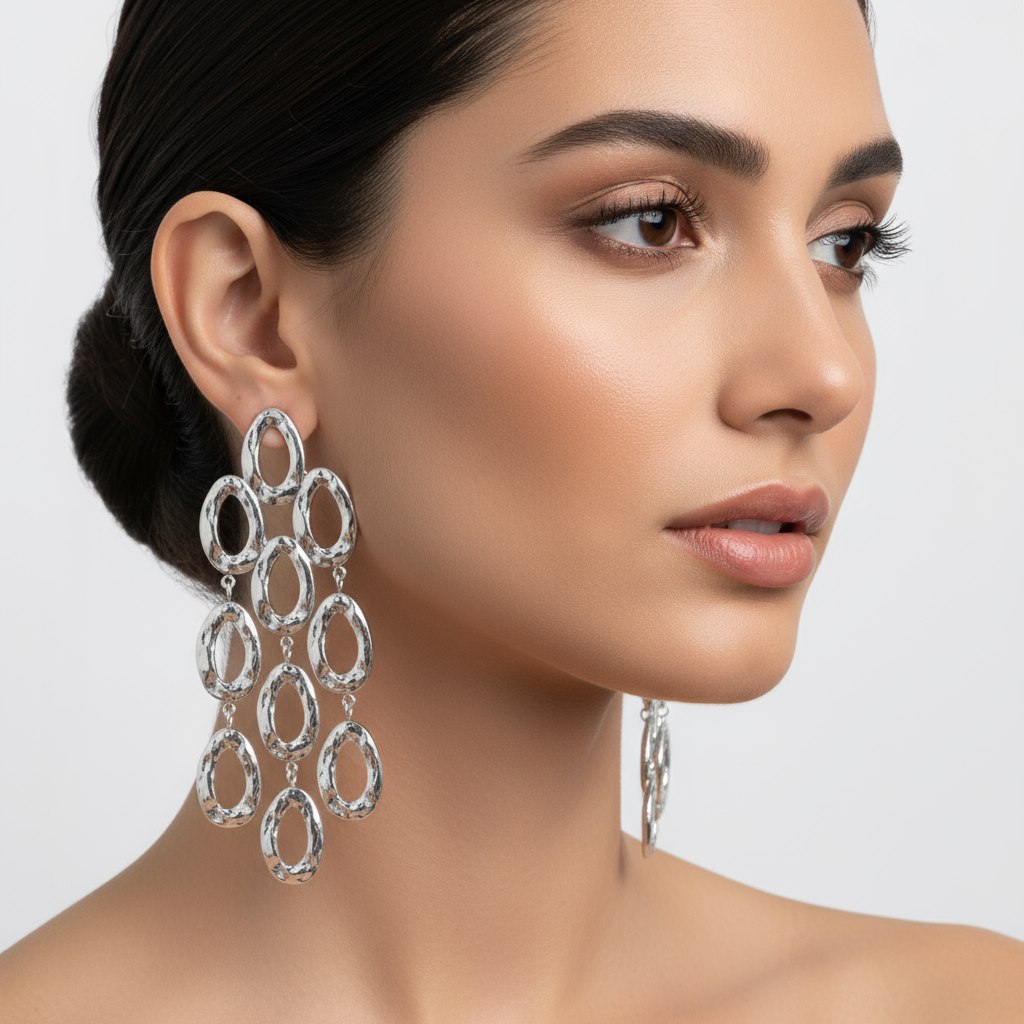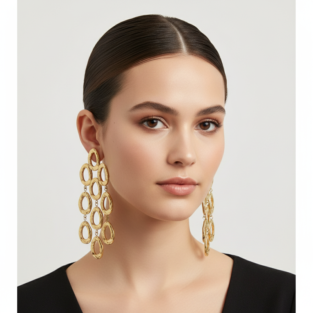 Com design geométrico marcante, esses brincos longos tipo dangle combinam elegância e atitude em uma única peça.