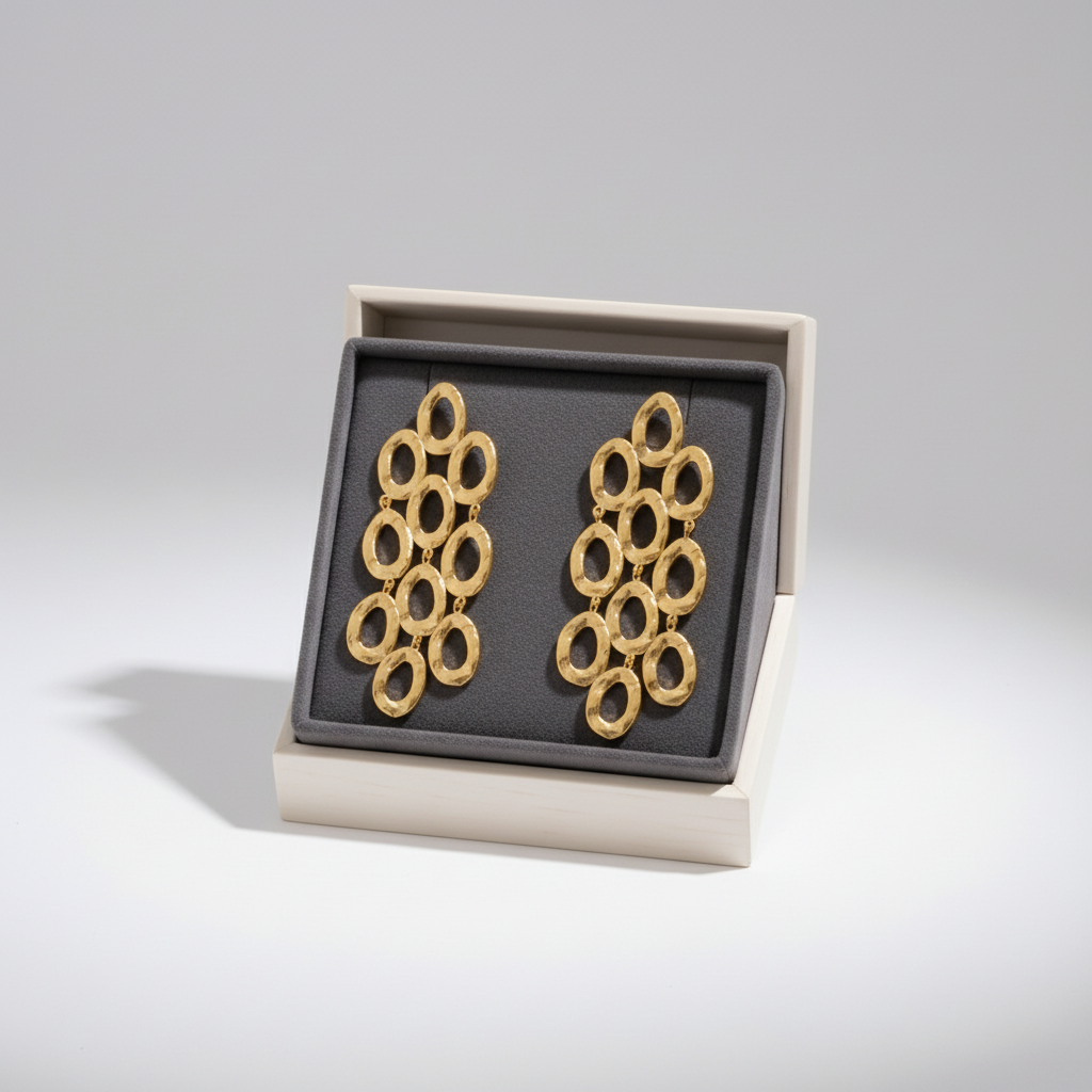 Produzidos em aço inoxidável com banho de ouro 18K por tecnologia PVD, oferecem brilho intenso, resistência à água e acabamento premium. O estilo statement adiciona personalidade ao look, ideal para quem busca sofisticação moderna e presença em qualquer ocasião.