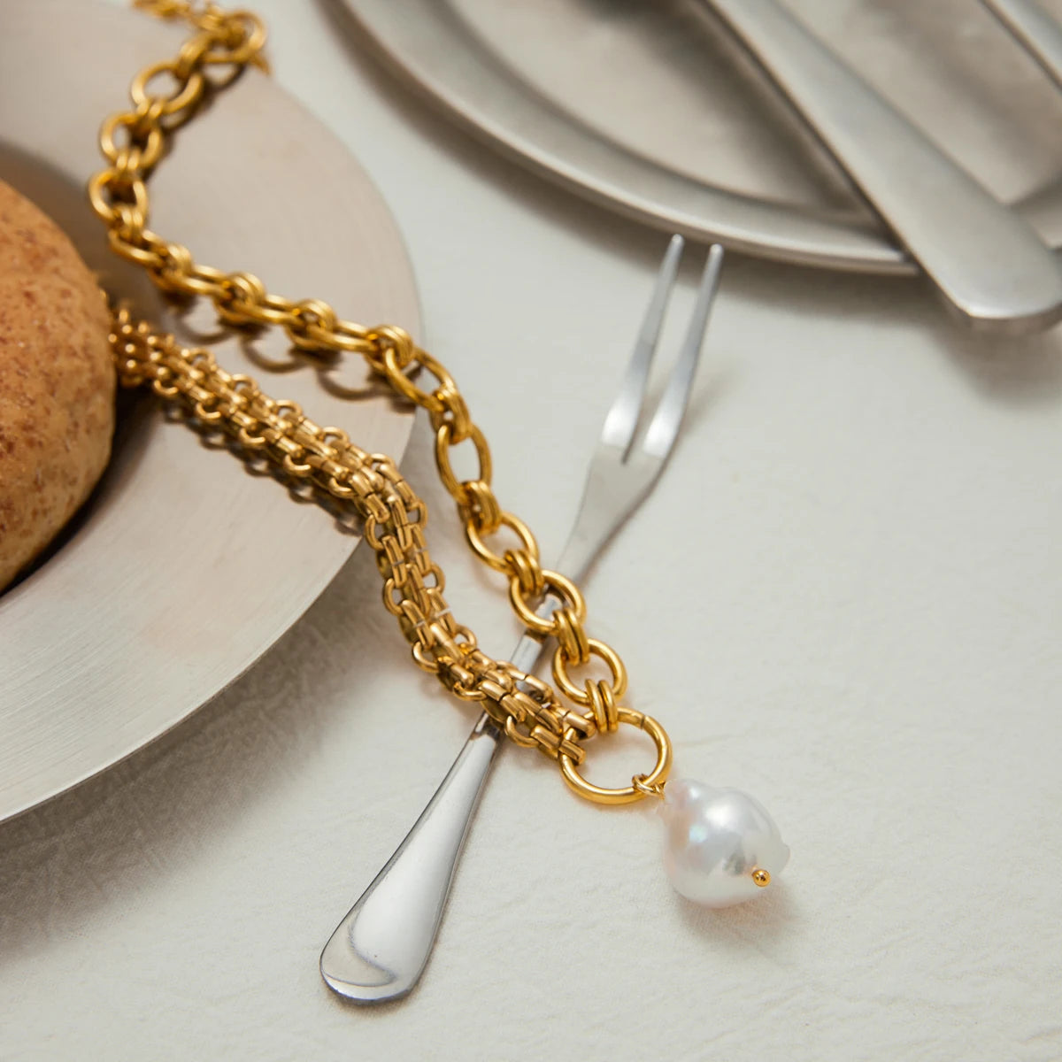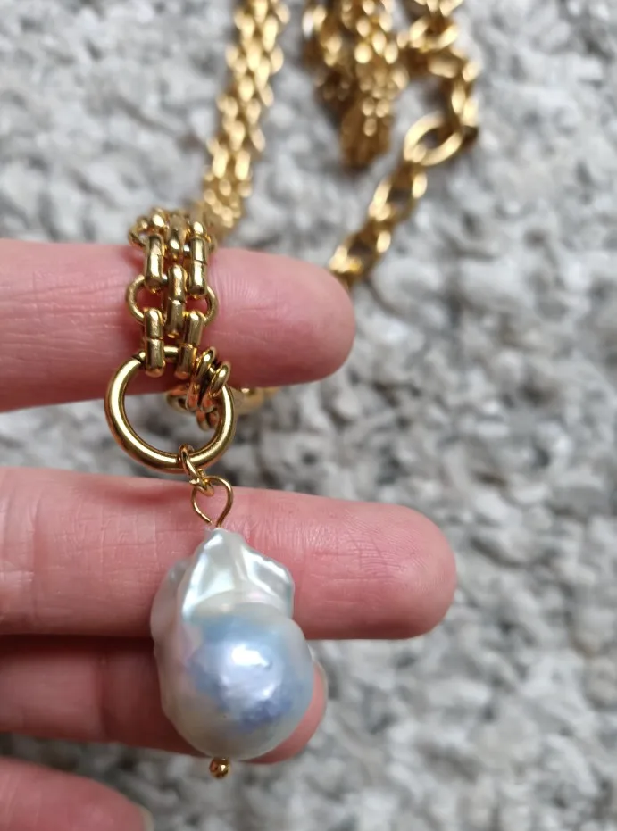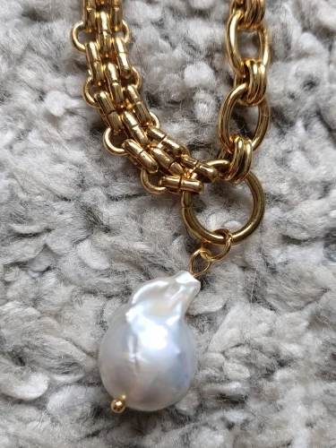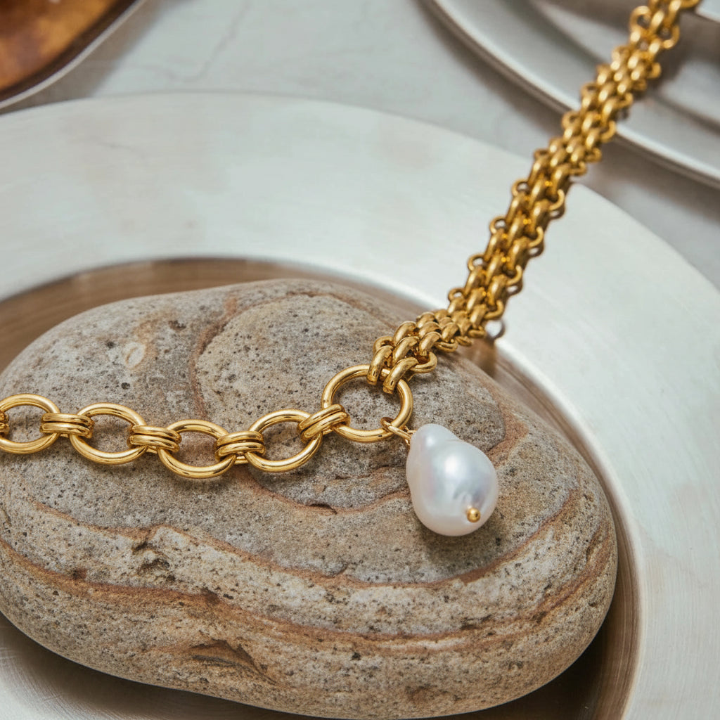 Um colar que une o charme atemporal das pérolas naturais com a força e o brilho do aço inoxidável.