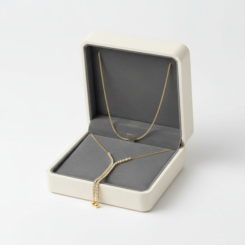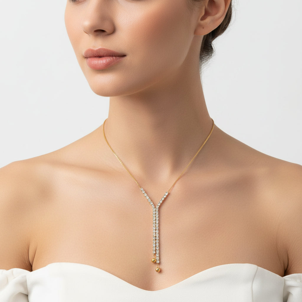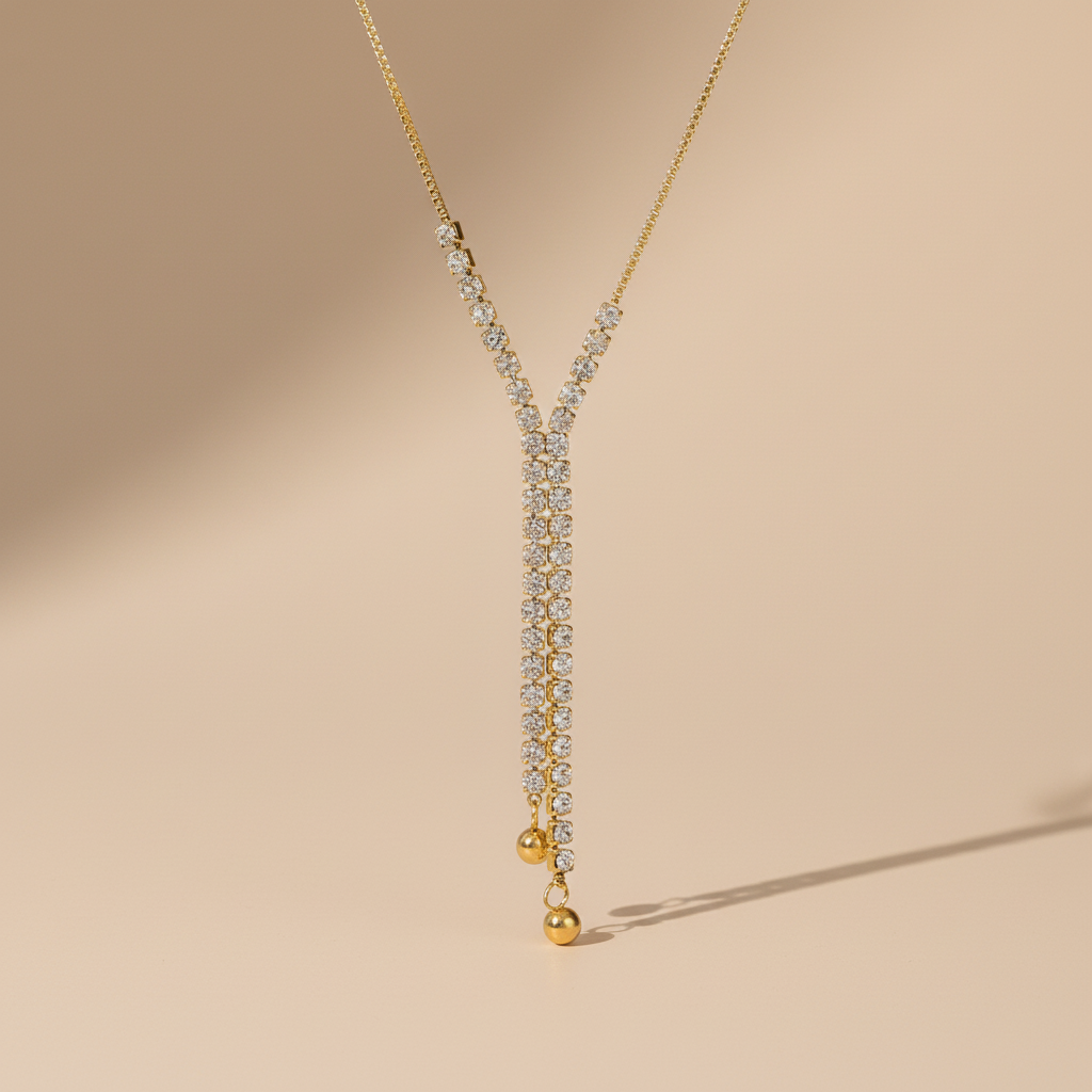 O Colar Longo com Pingente de Zircônia Branca é uma joia fashion que une resistência e beleza em um design moderno.