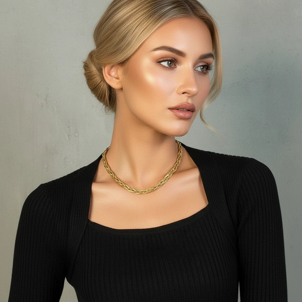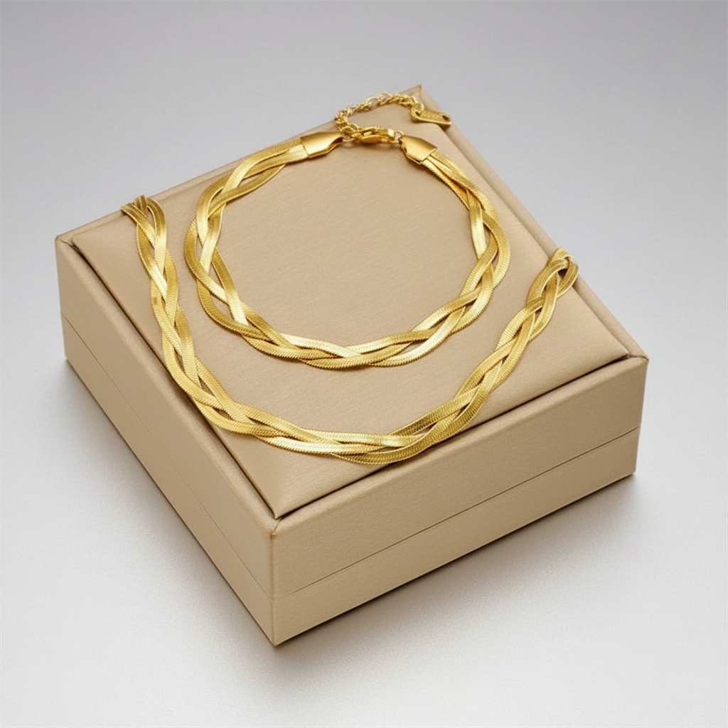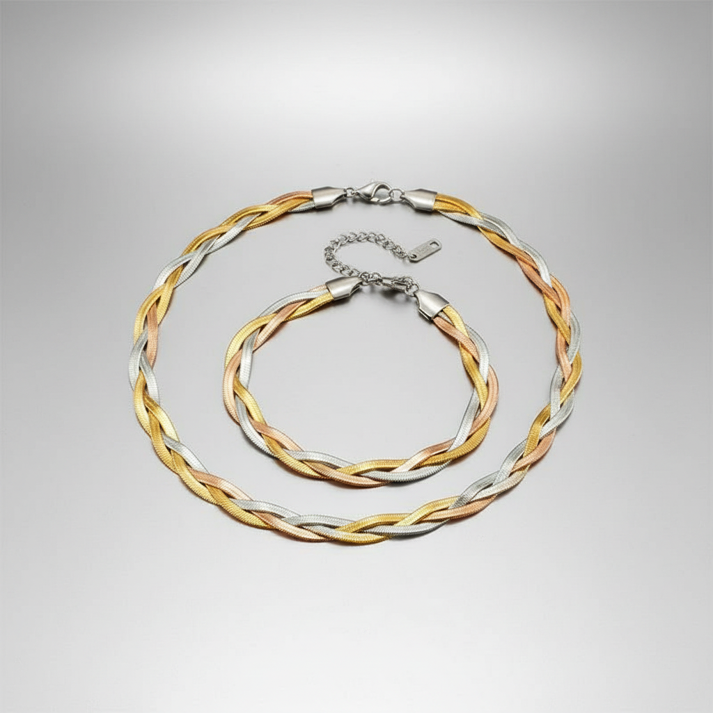 Moderno e versátil, este conjunto de colar e pulseira no estilo snake chain, criando um visual elegante e contemporâneo. Feito em aço inoxidável 316L, é resistente, brilhante e ideal para quem valoriza acessórios duráveis e à prova d’água. O design entrelaçado adiciona sofisticação, perfeito para festas, produções fashion e composições do dia a dia com toque trendy.