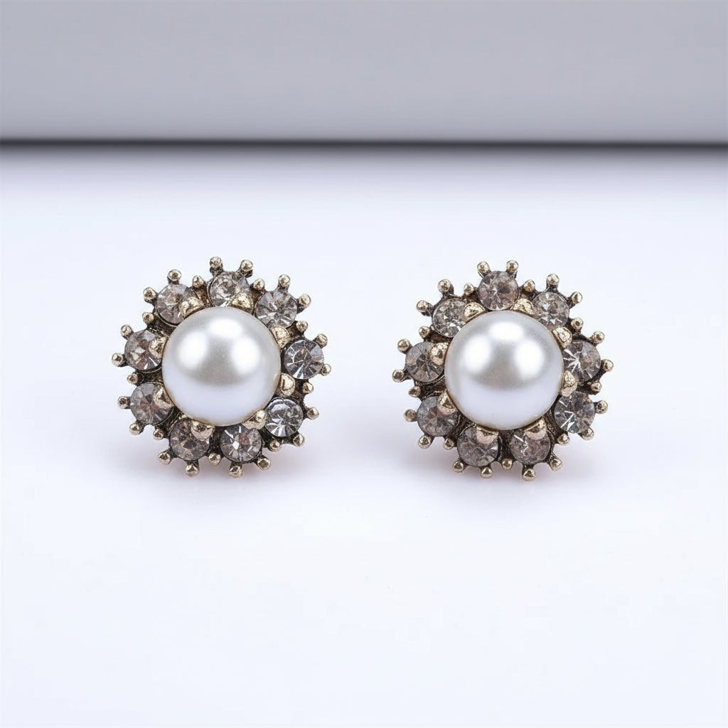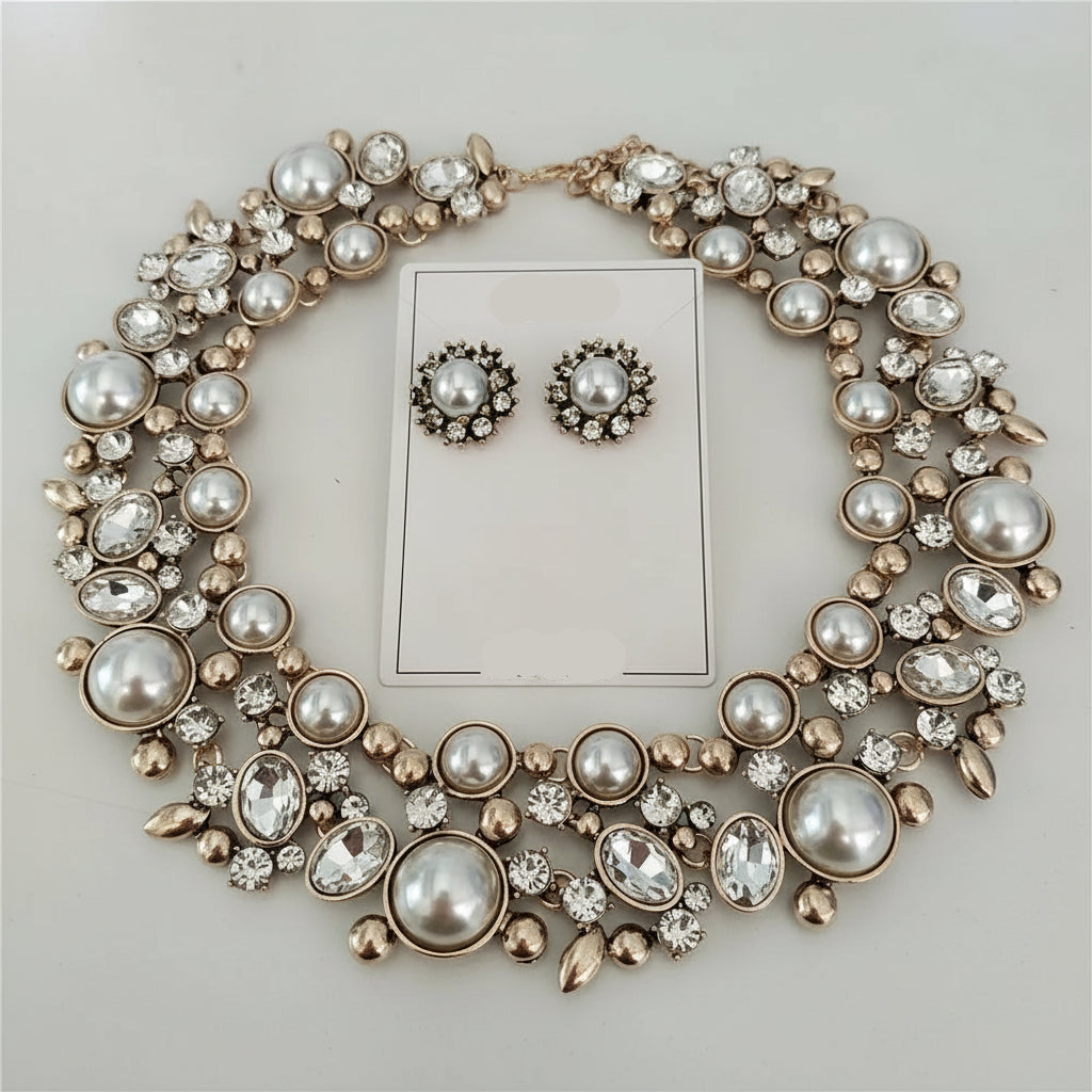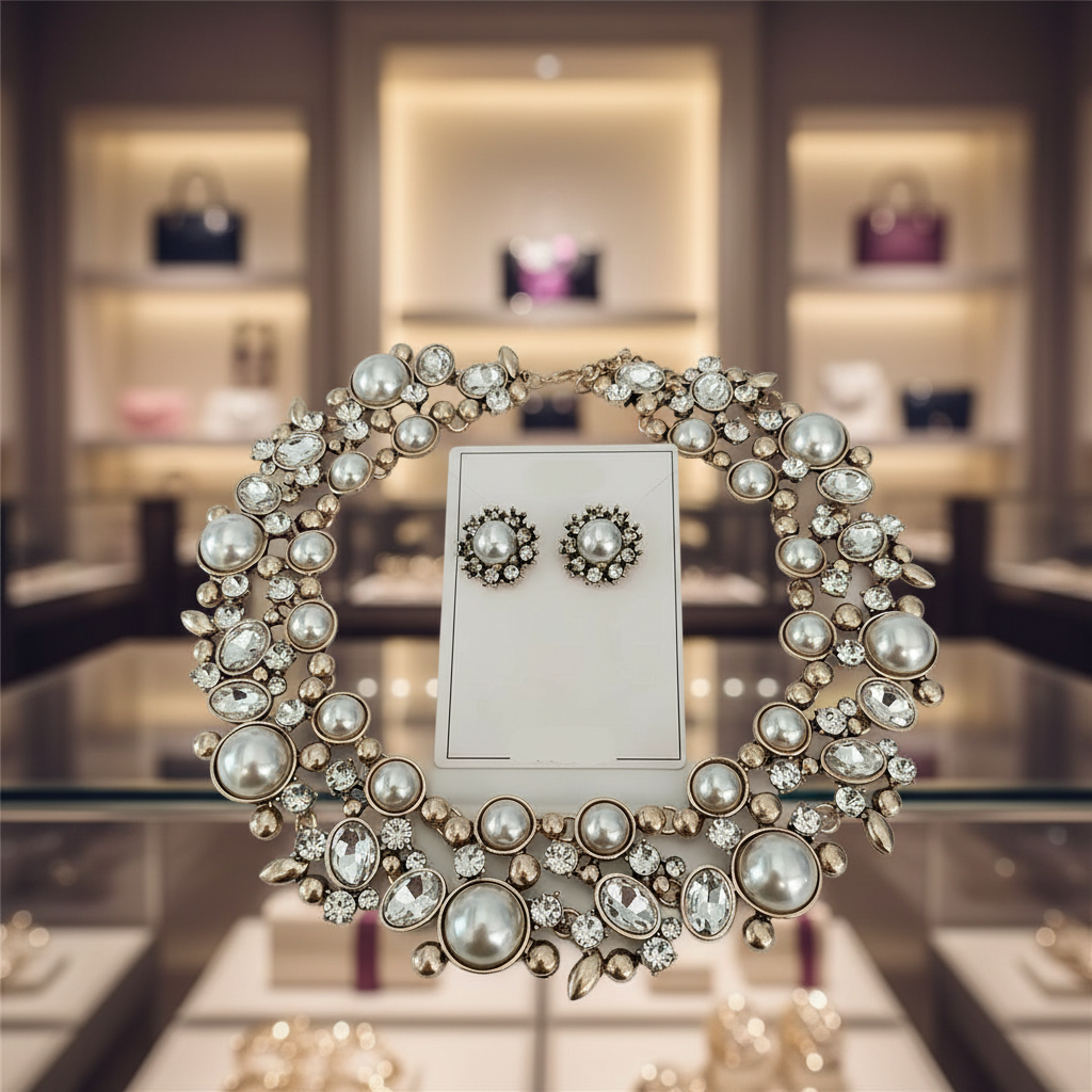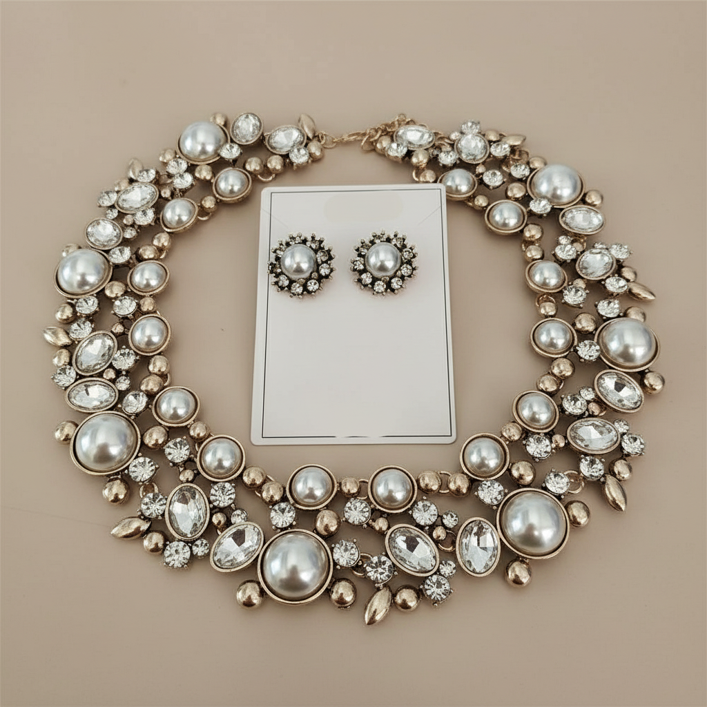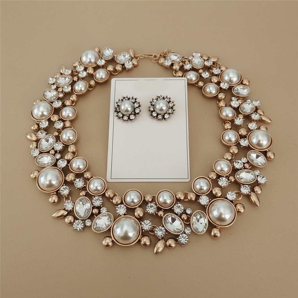 O colar em formato bib possui design geométrico rico em detalhes, com cristais e pérolas sintéticas que criam impacto imediato.