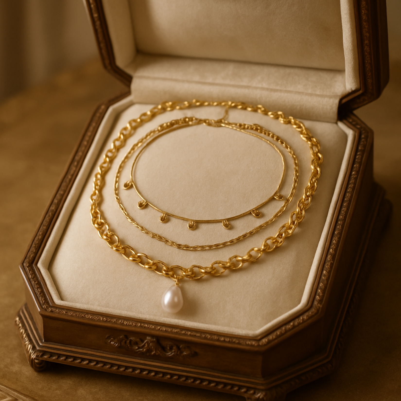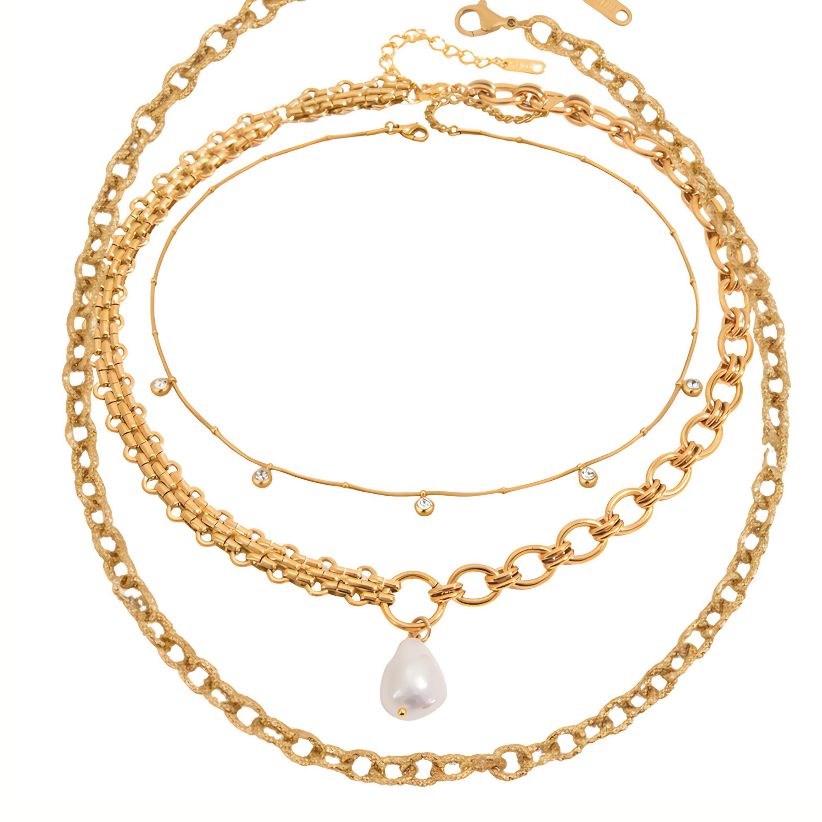 Um conjunto com 3 colares que une o charme atemporal das pérolas naturais com a força e o brilho do aço inoxidável.