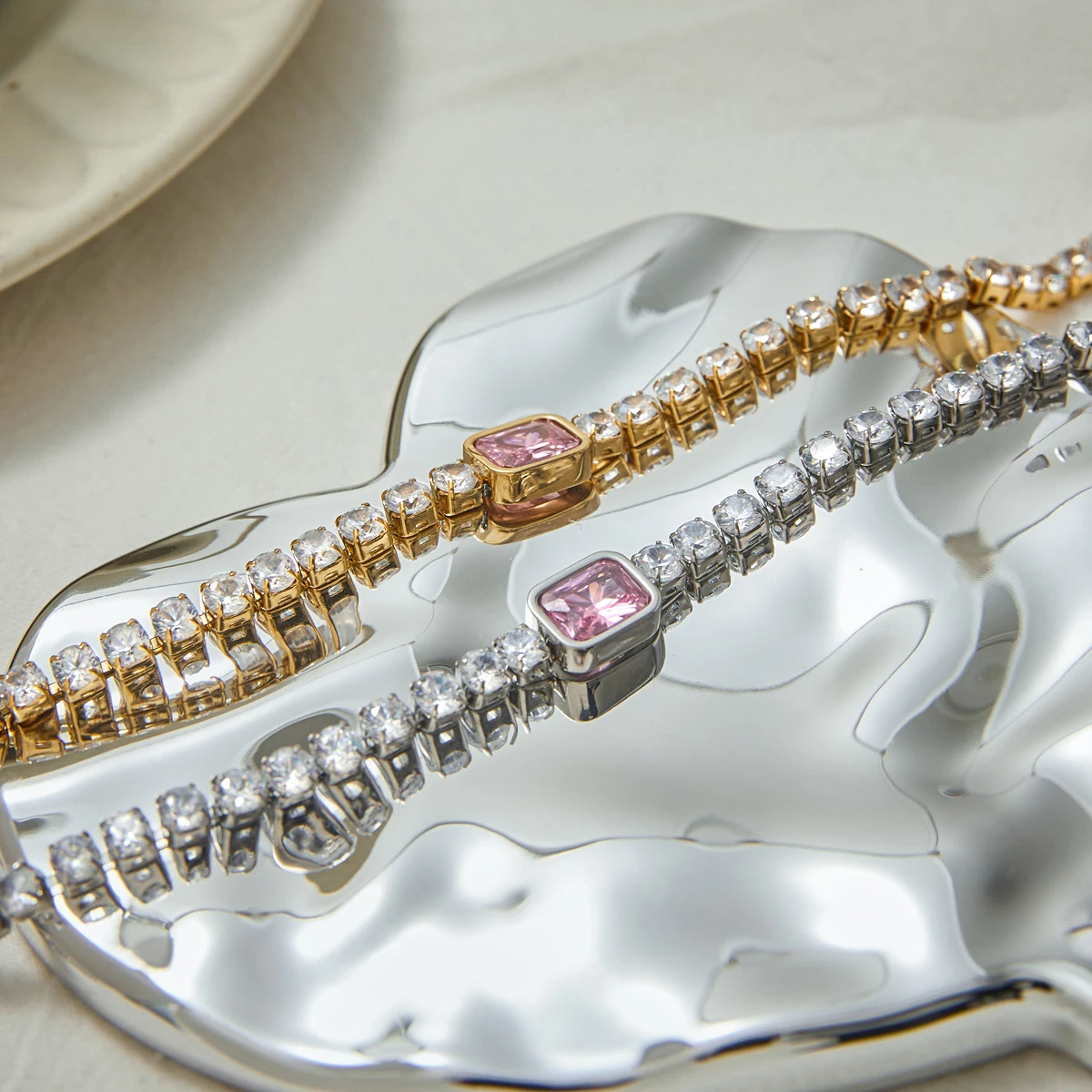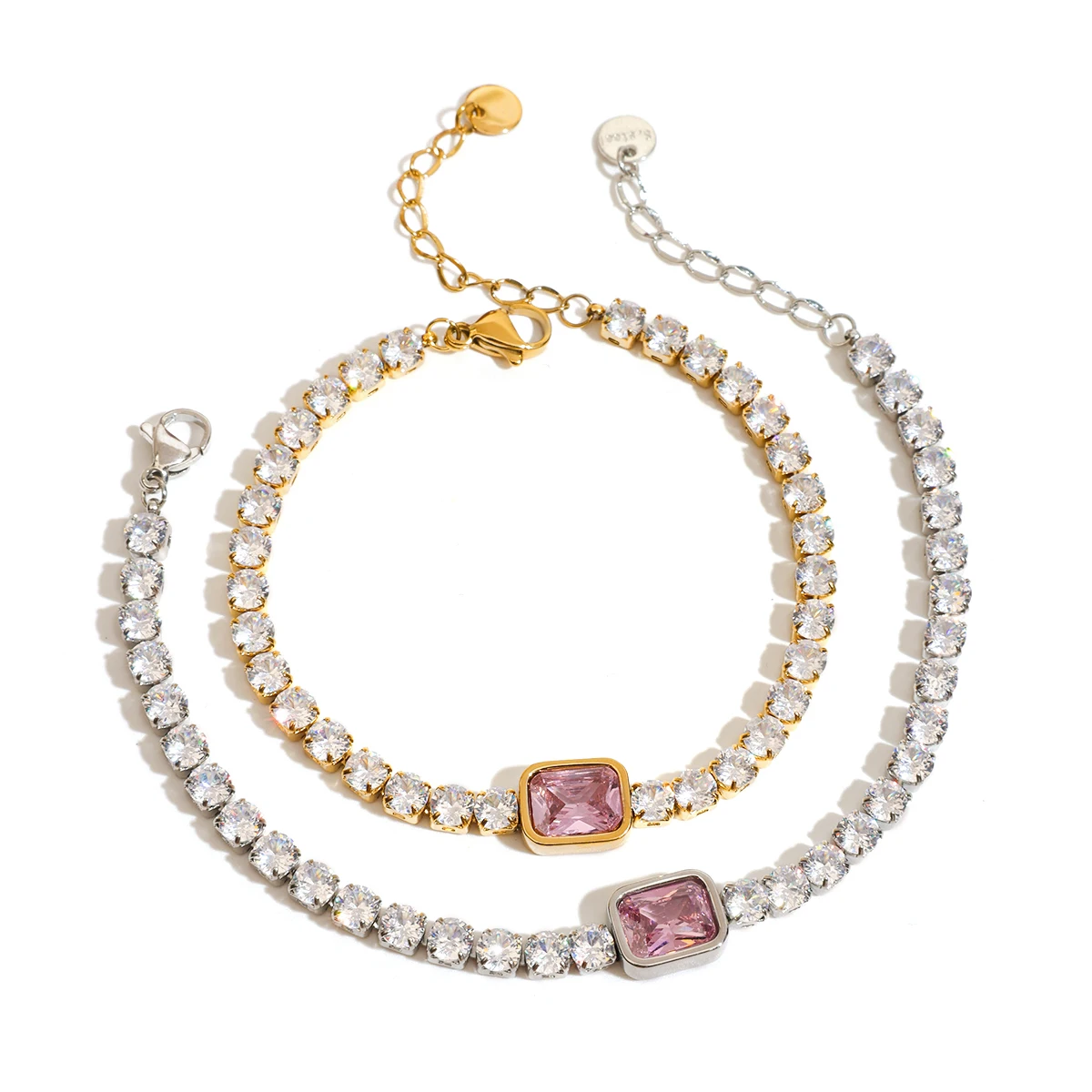 Conjunto de Duas Pulseiras com Zircônia Rosa – Aço Inoxidável, Luxo Moderno e Brilho Sofisticado