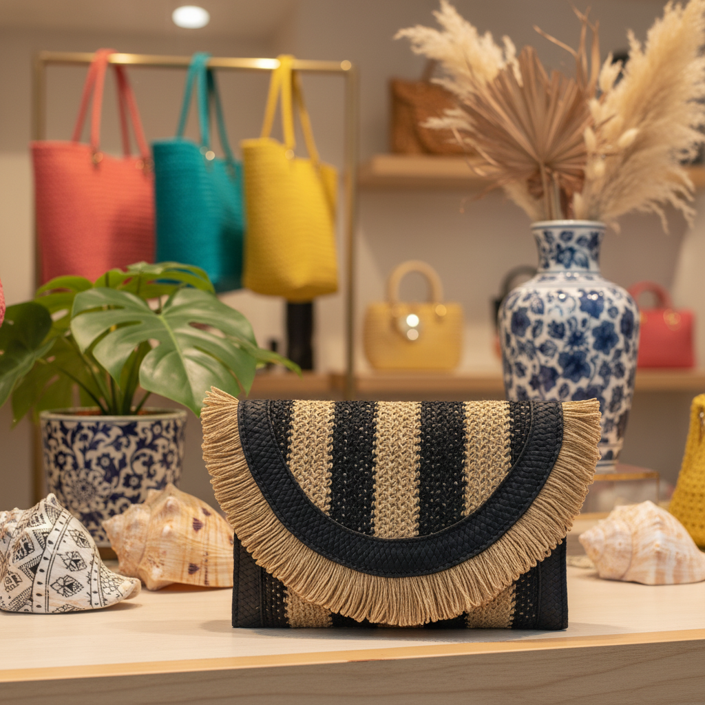 Uma clutch leve, artesanal e cheia de charme, feita em palha trançada à mão para trazer aquele toque natural perfeito para o verão.