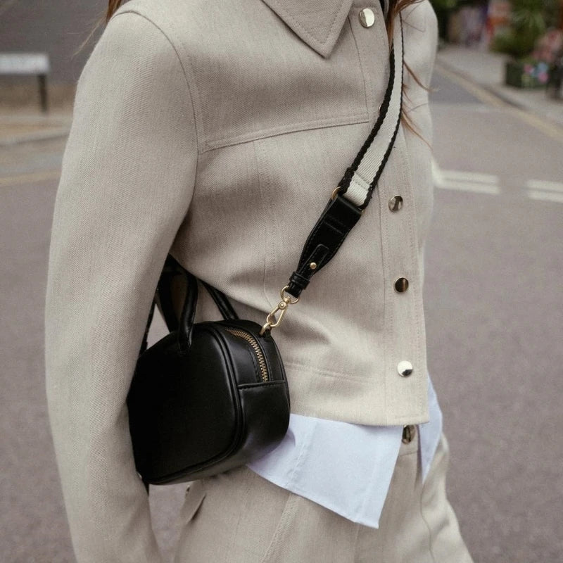 - Alça de mão e alça dupla a tiracolo removível, uma em tecido tipo canvas e outra com pesponto