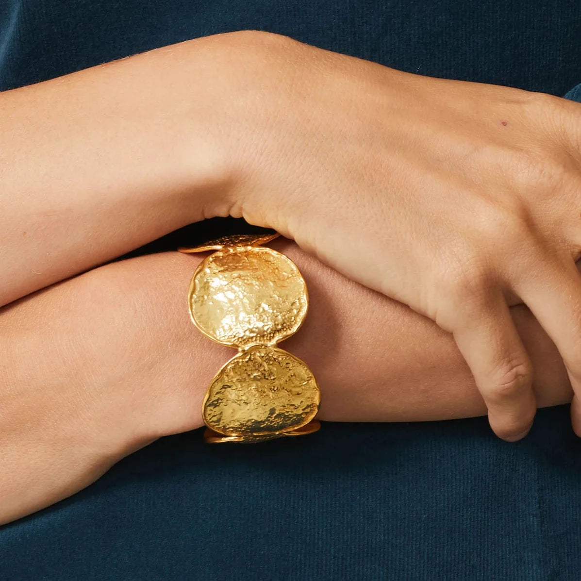 Com textura martelada e acabamento dourado 18K, esta pulseira rígida combina elegância e força em um design contemporâneo e imponente.